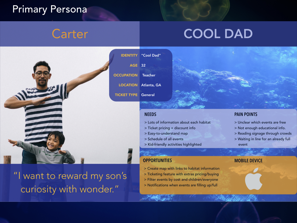 Our team was tasked with designing a new digital product concept for the Georgia Aquarium within a 2 week sprint. They are currently expanding their habitats and plan on having an entirely new layout by 2020, making this a great time to design a mobile product for visitors to update and improve their experience, overall. We interviewed visitors about their experiences at the aquarium, looked at the current product and competitors’ products, and went to the aquarium ourselves to get a feel for what the current experience is and how it could be improved.