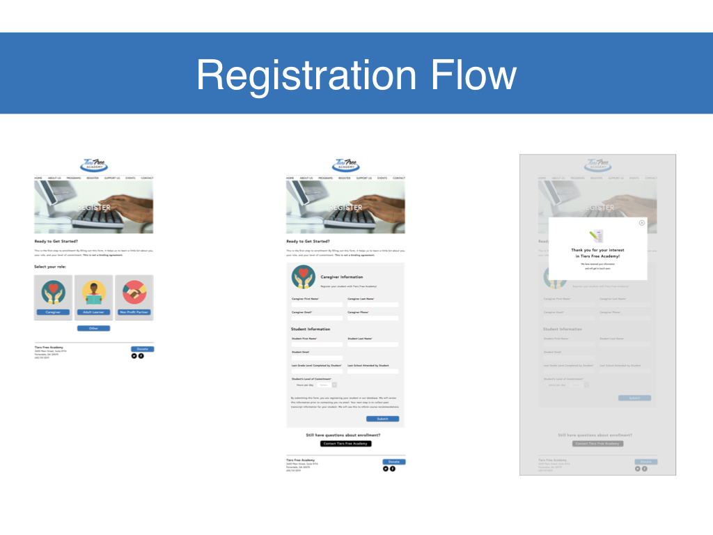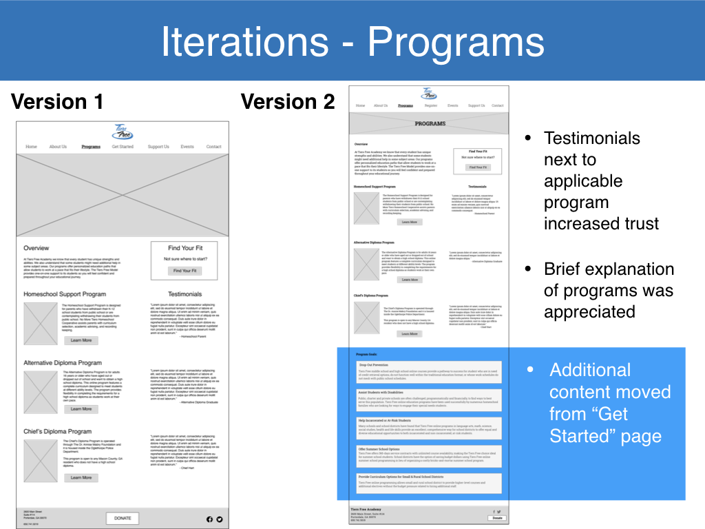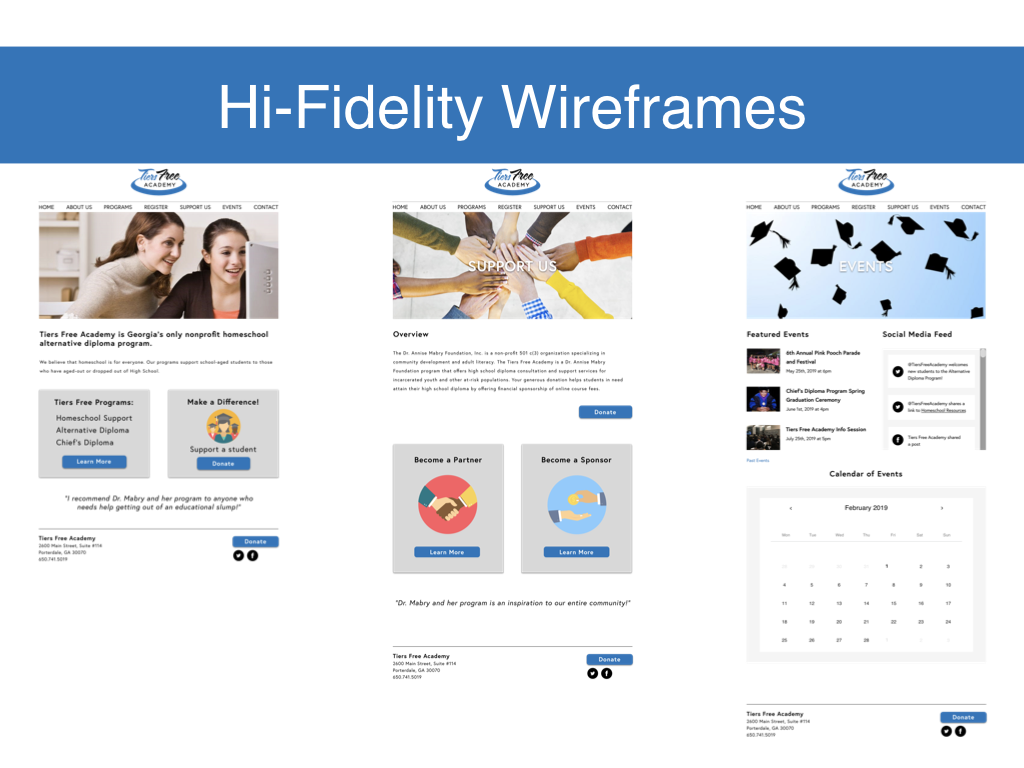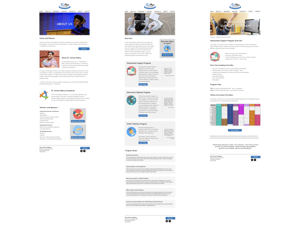 We were challenged with redesigning the Tiers Free Academy Website within a 3 week sprint. At initial glance the website looked good visually: it had large photos, working links, & nice colors. But as we tried to find specific information within the website, it became clear that navigating the website was difficult. Selections in drop-downs may not have matched the header or webpage. The same program “Alternative Diploma Program” was labeled differently on various pages. It took us a couple days to try to wade through all the different information & process exactly what was the purpose of the website; try to disentangle Dr. Mabry, Tiers Free Academy, & the Dr. Mabry Foundation; as well as trying to understand the program in general as well as the sub-programs & how they function. It was a sign of a failure of the current website that we had so many questions unanswered & couldn’t find the information online, they all had to be answered in phone calls or emails with Dr. Mabry or the Program Coordinator.