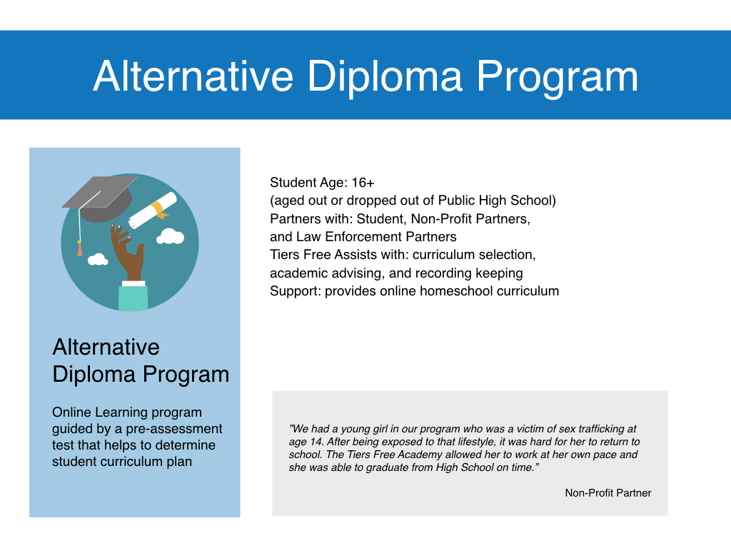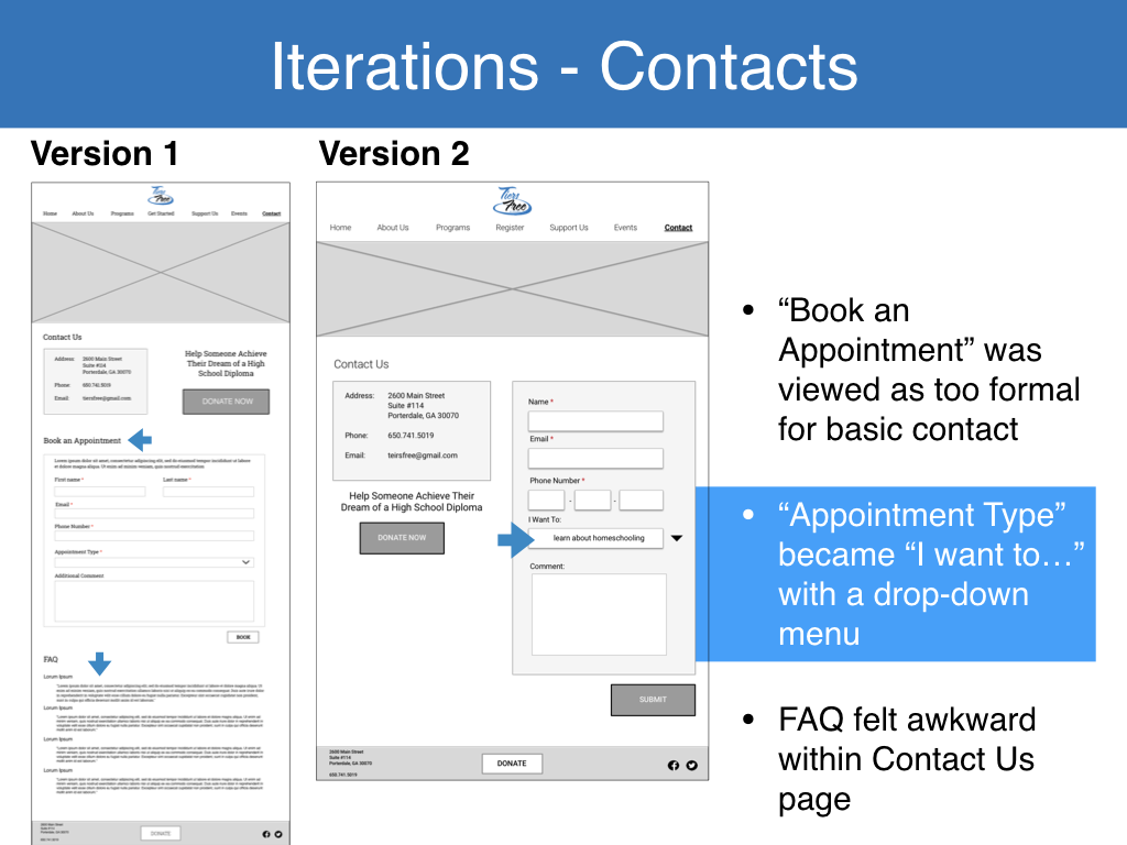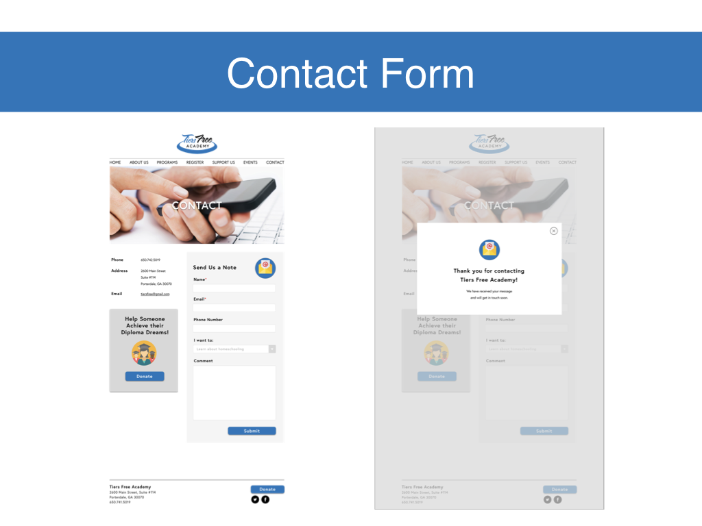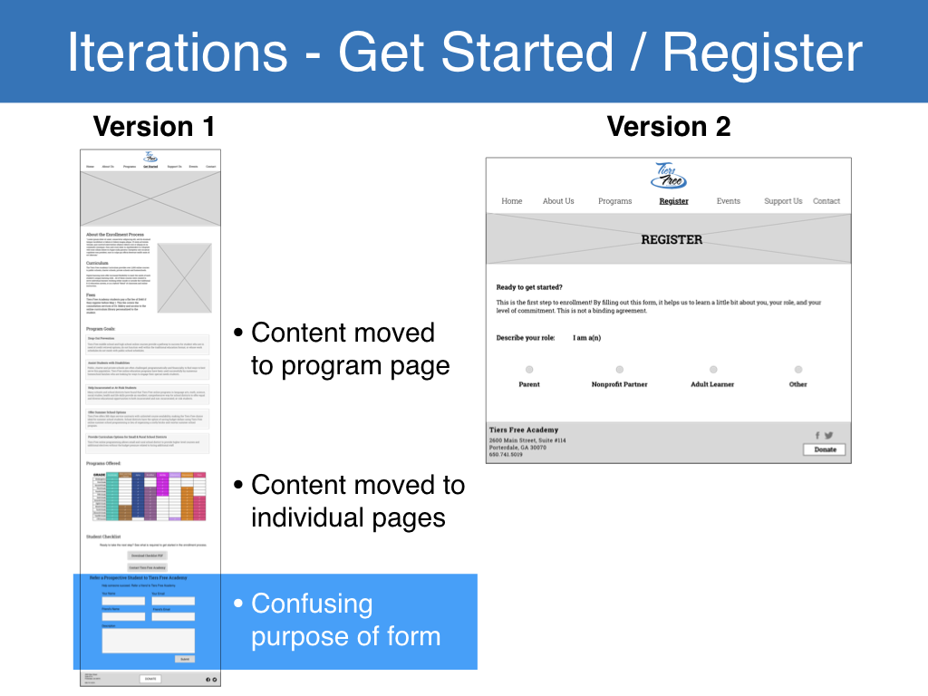 We were challenged with redesigning the Tiers Free Academy Website within a 3 week sprint. At initial glance the website looked good visually: it had large photos, working links, & nice colors. But as we tried to find specific information within the website, it became clear that navigating the website was difficult. Selections in drop-downs may not have matched the header or webpage. The same program “Alternative Diploma Program” was labeled differently on various pages. It took us a couple days to try to wade through all the different information & process exactly what was the purpose of the website; try to disentangle Dr. Mabry, Tiers Free Academy, & the Dr. Mabry Foundation; as well as trying to understand the program in general as well as the sub-programs & how they function. It was a sign of a failure of the current website that we had so many questions unanswered & couldn’t find the information online, they all had to be answered in phone calls or emails with Dr. Mabry or the Program Coordinator.